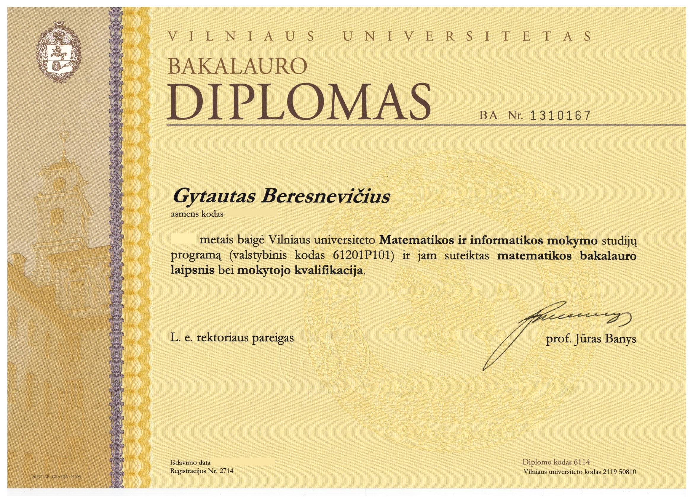 VU (toliau Vilniaus universitetas) bakalauro diplomas. VU magistras (su pagyrimu).
